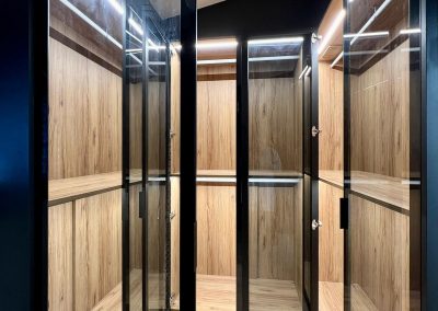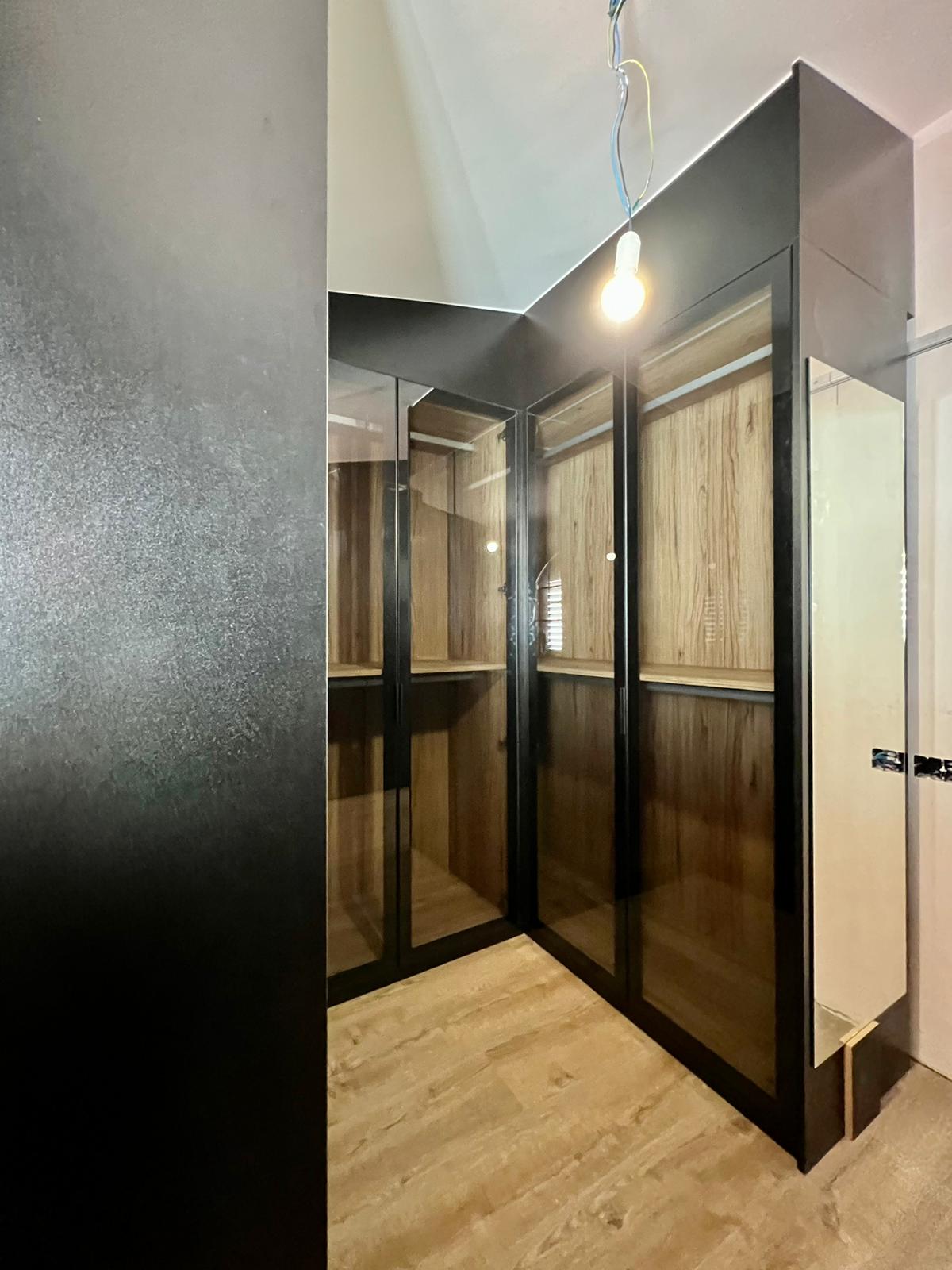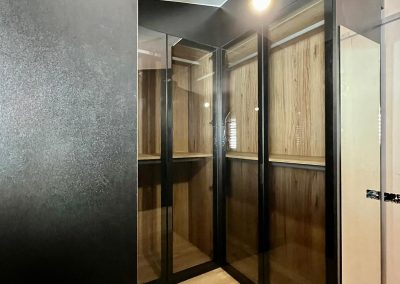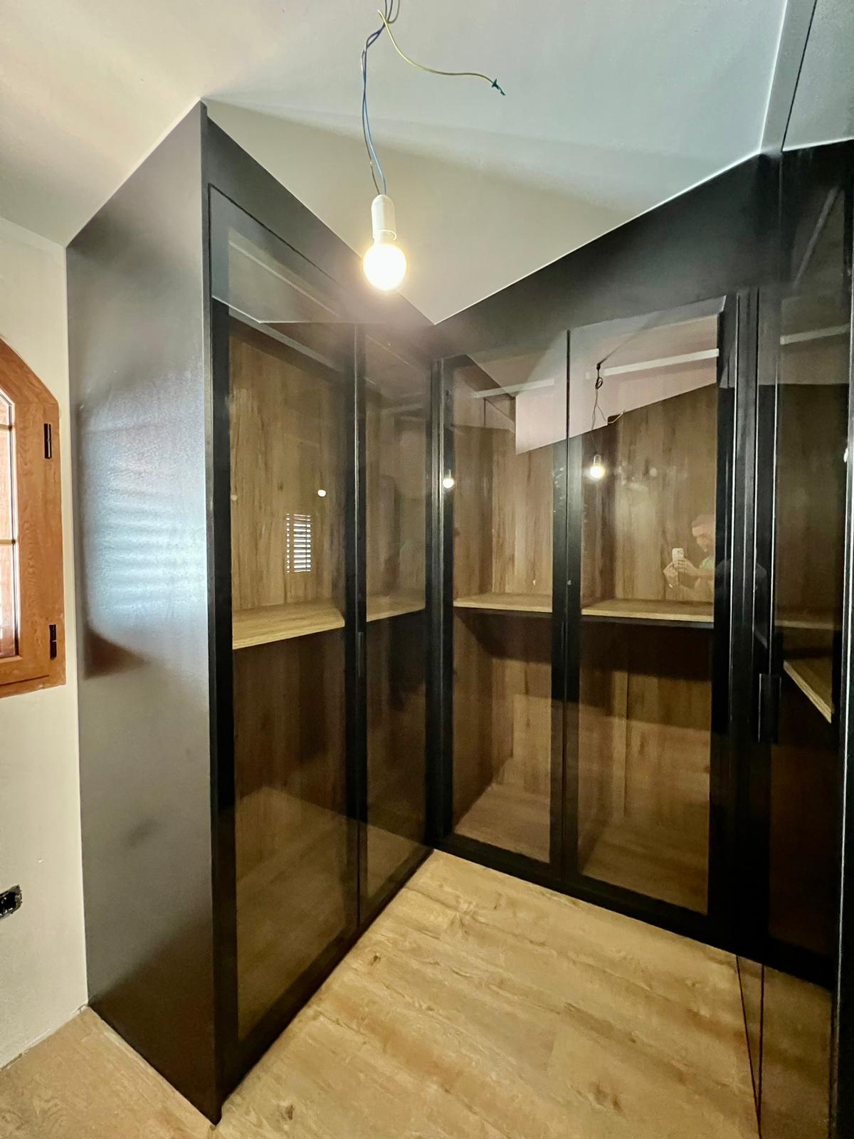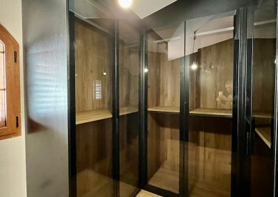 Vestidor en forma de U, tiene interiores de roble Guadarrama que le dan un toque rústico y acogedor, mientras que las vitrinas en negro con cristal humo añaden un toque moderno y sofisticado. Es perfecto para mantener tus prendas organizadas y exhibir tus accesorios con estilo en cualquier espacio.