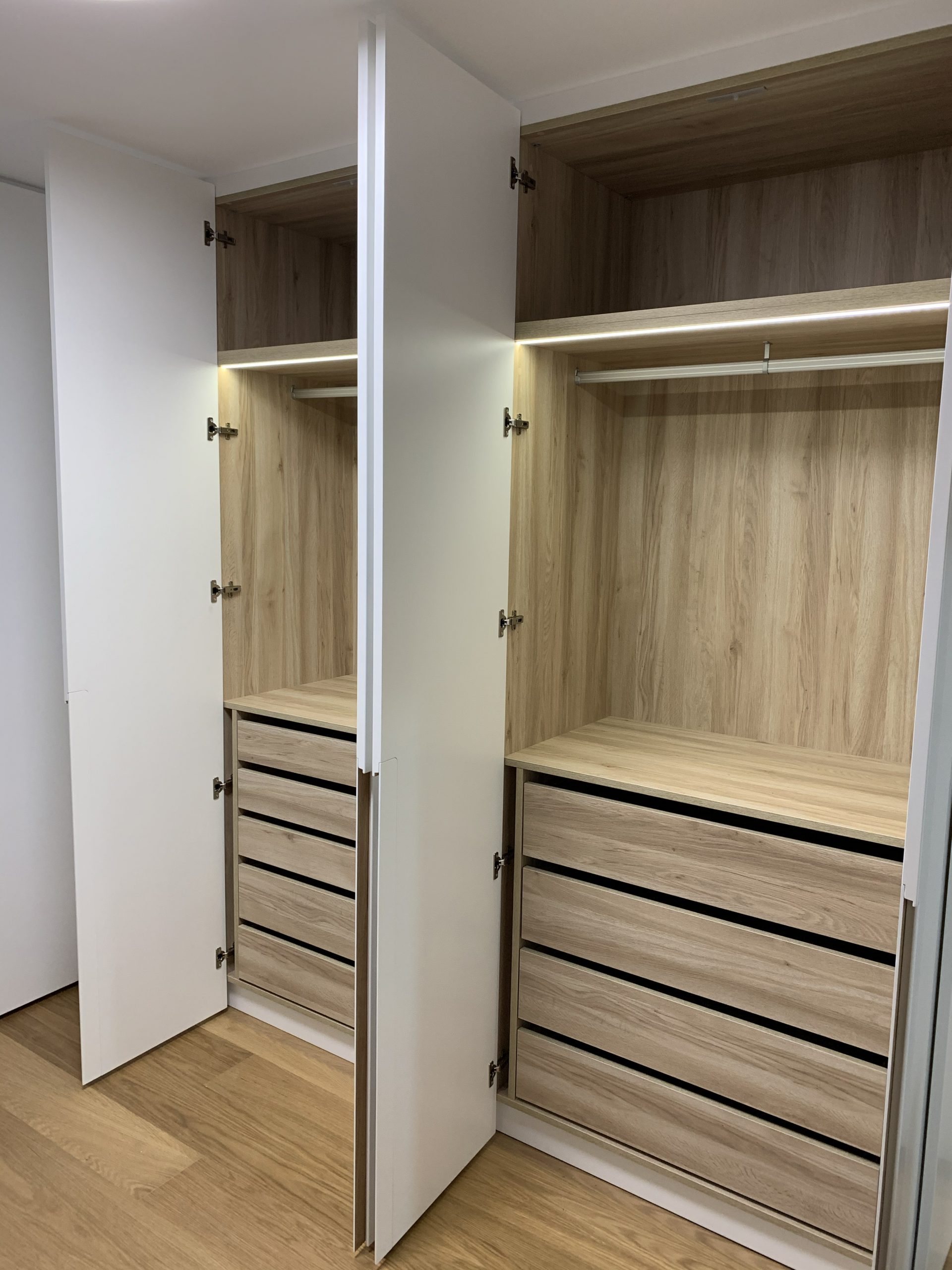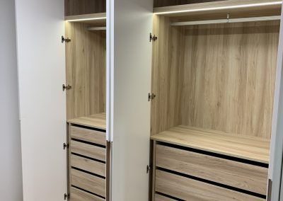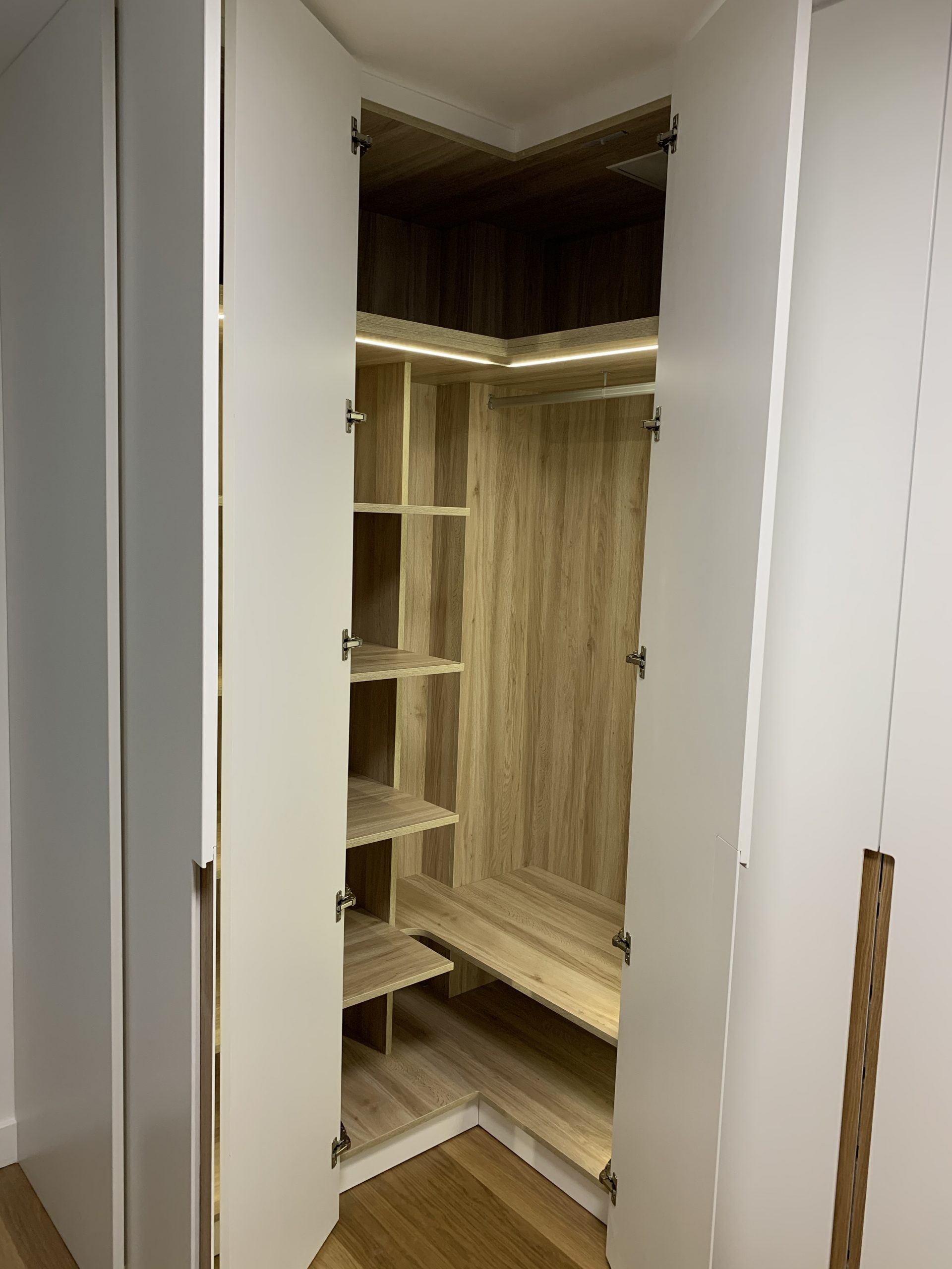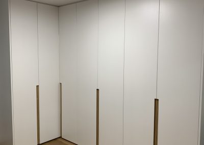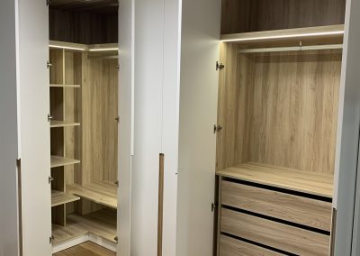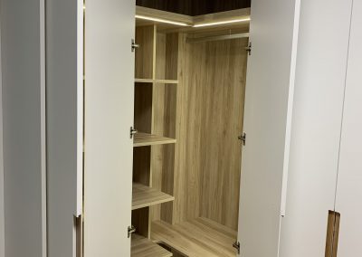 Armario en forma de L, con interiores revestidos en roble Guadalupe y equipado con iluminación LED para una mejor visibilidad en su interior. Su exterior lacado en blanco brinda una apariencia elegante y atemporal, complementado con un tirador tipo uñero a media altura elaborado en roble macizo, añadiendo un toque de distinción y calidez al diseño. Esta combinación de materiales y detalles ofrece una solución de almacenamiento funcional y estéticamente atractiva para cualquier espacio.