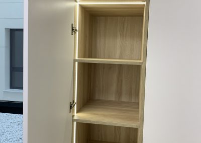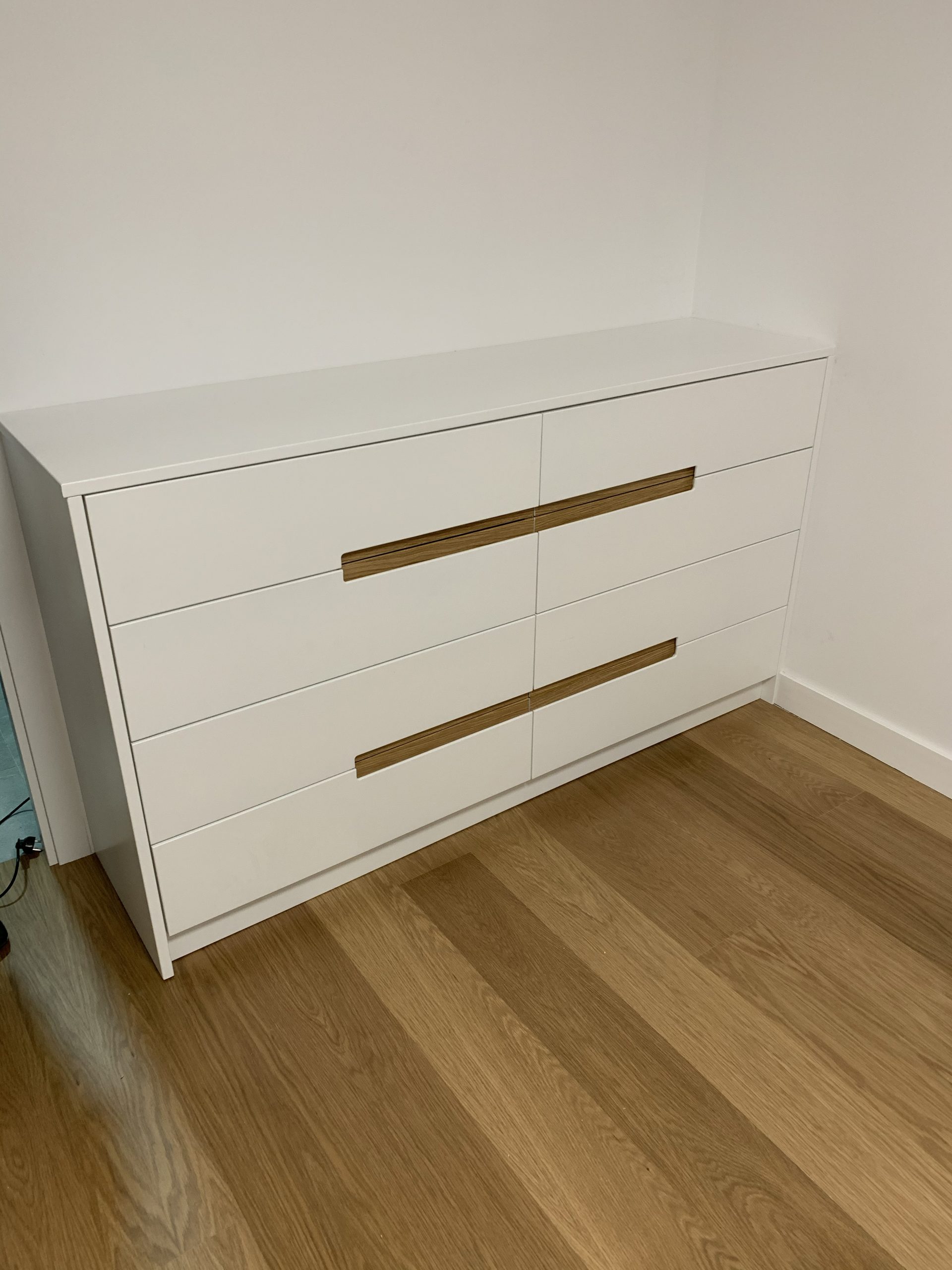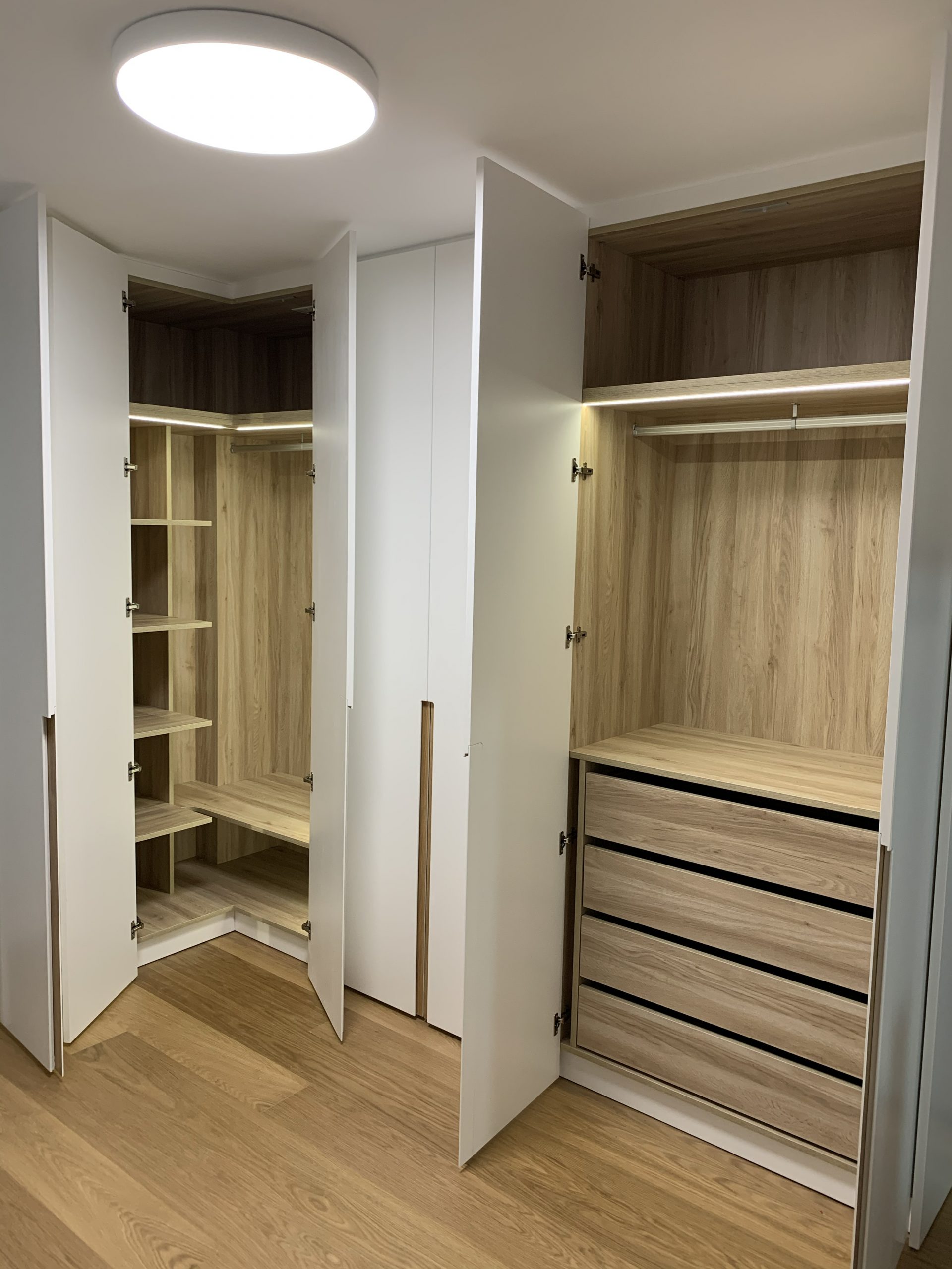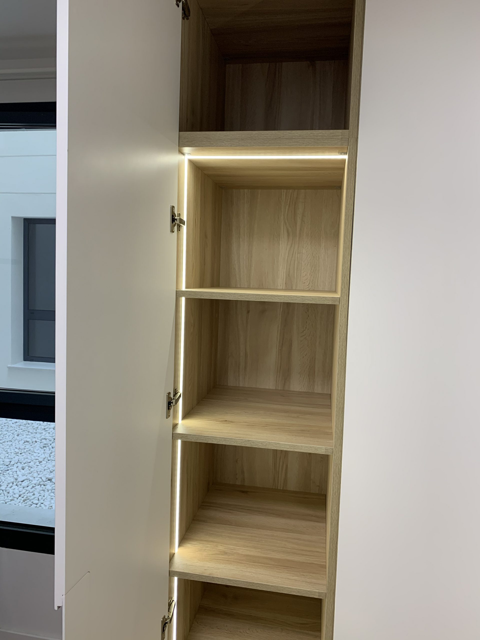 Armario en forma de L, con interiores revestidos en roble Guadalupe y equipado con iluminación LED para una mejor visibilidad en su interior. Su exterior lacado en blanco brinda una apariencia elegante y atemporal, complementado con un tirador tipo uñero a media altura elaborado en roble macizo, añadiendo un toque de distinción y calidez al diseño. Esta combinación de materiales y detalles ofrece una solución de almacenamiento funcional y estéticamente atractiva para cualquier espacio.
