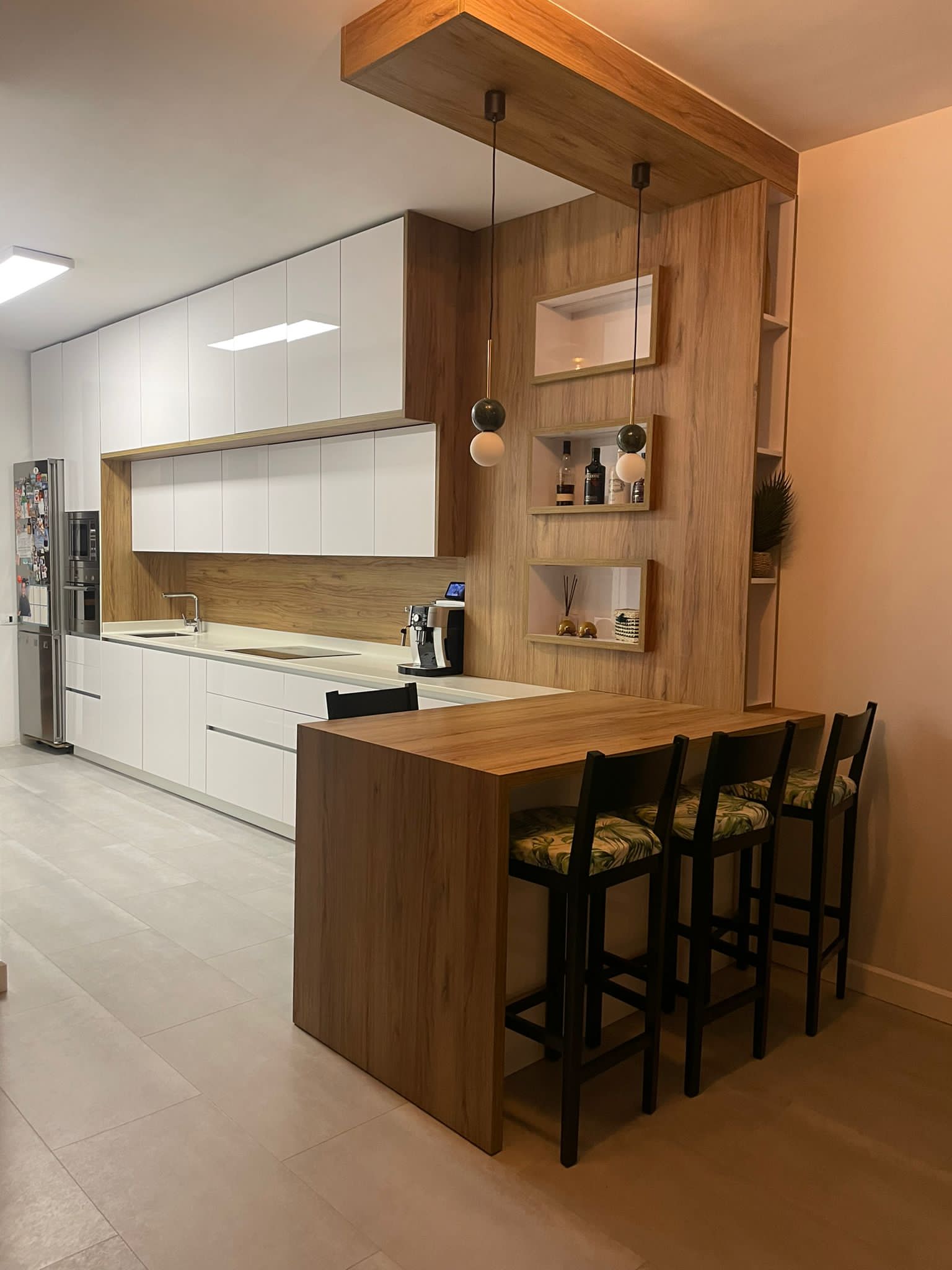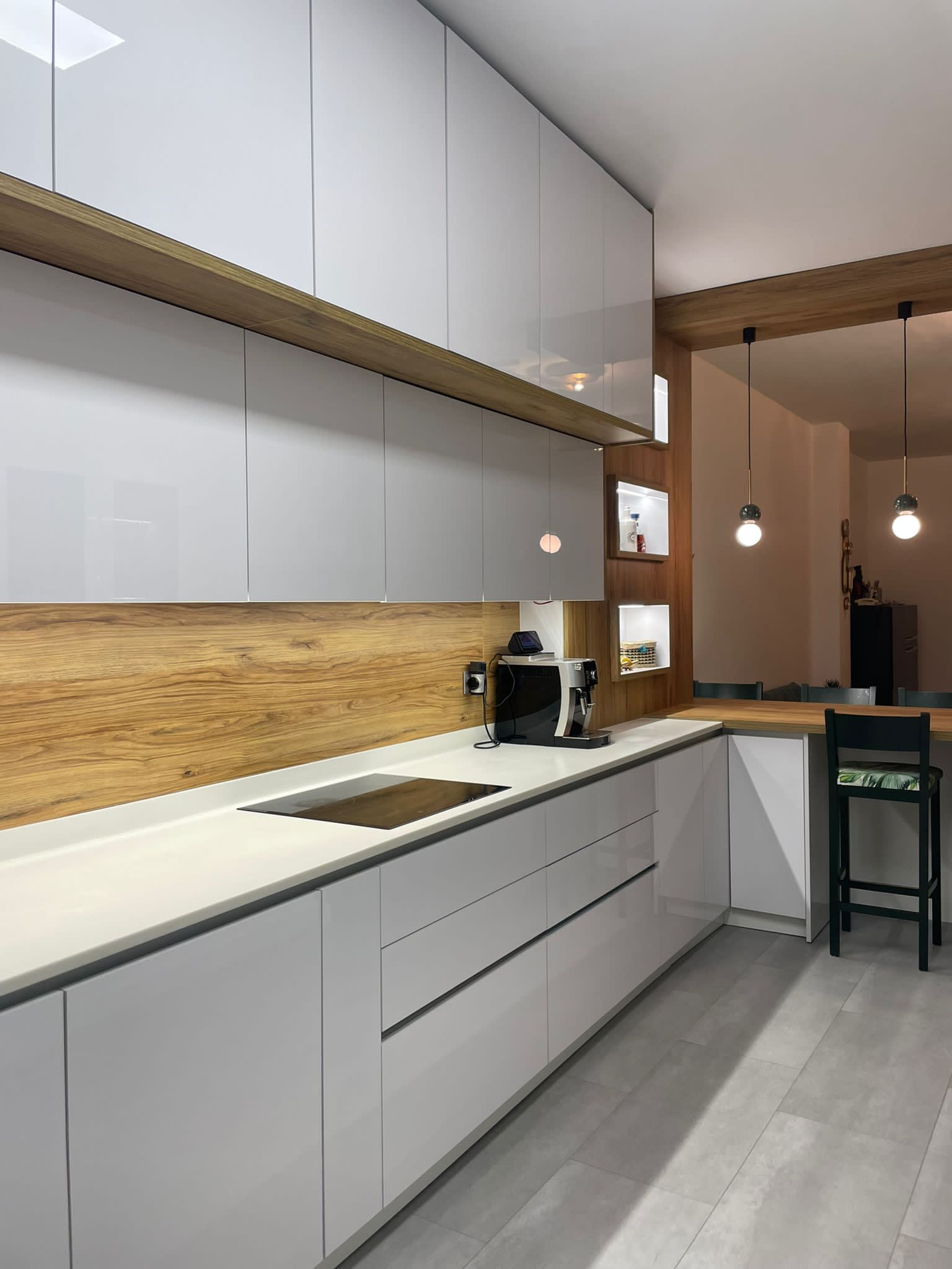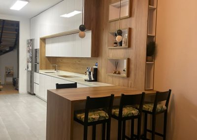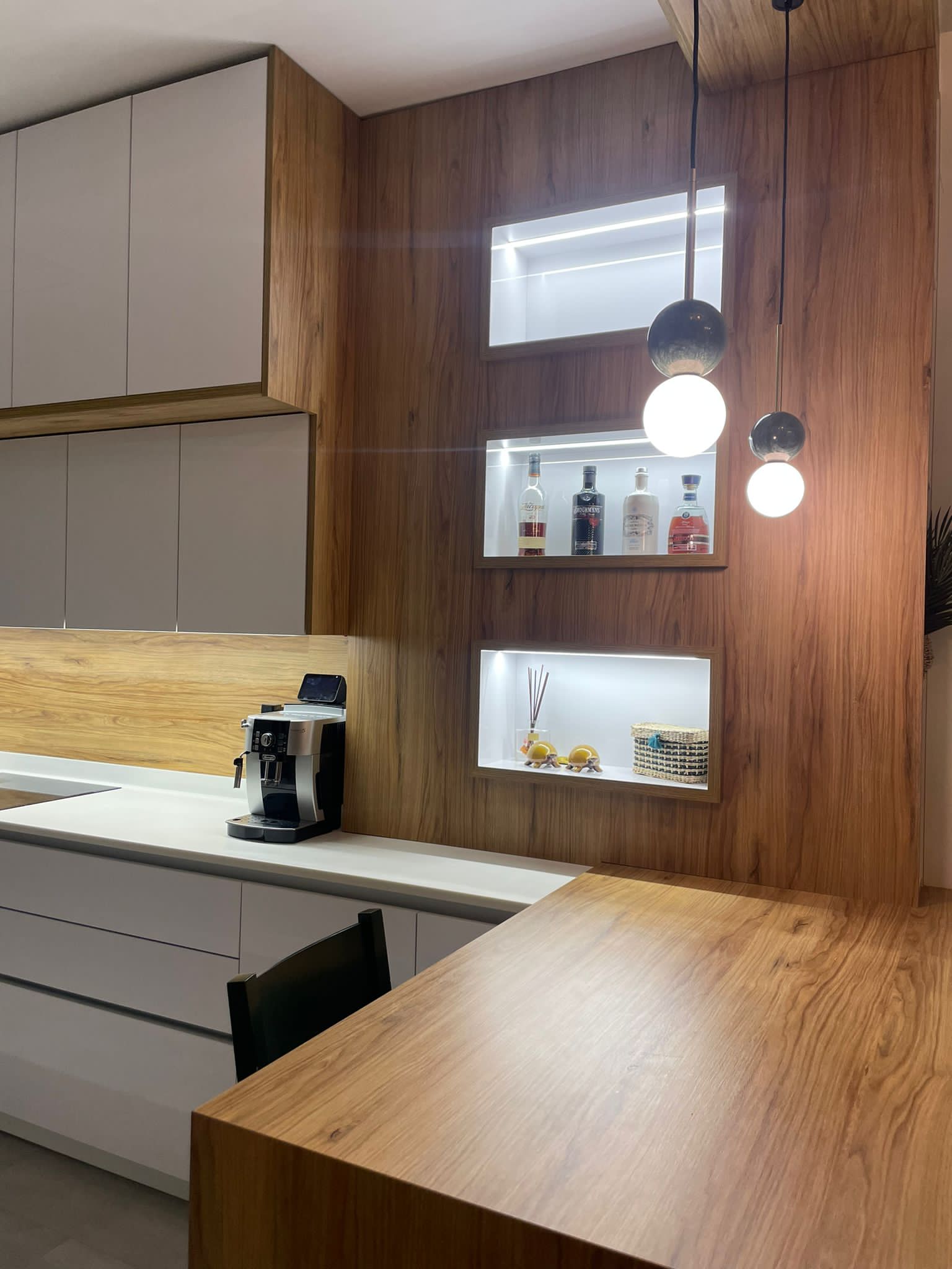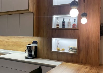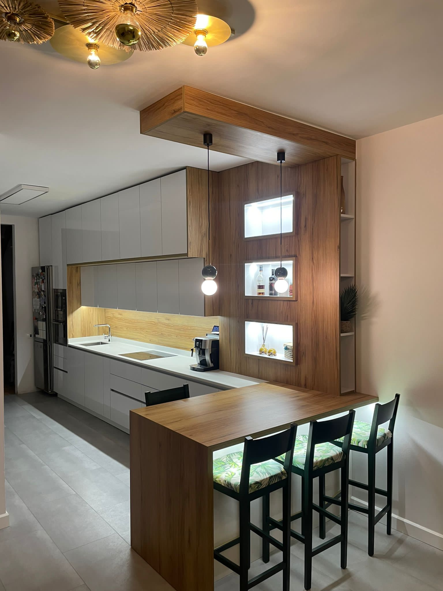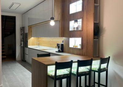 Cocina con exteriores en blanco brillo, destacando una elegante zona de barra equipada con cubos iluminados con luces LED. Los interiores, en tono gris antracita, añaden un toque de sofisticación. Esta combinación de elementos proporciona un ambiente moderno y funcional, ideal para disfrutar de momentos al aire libre con estilo y comodidad.