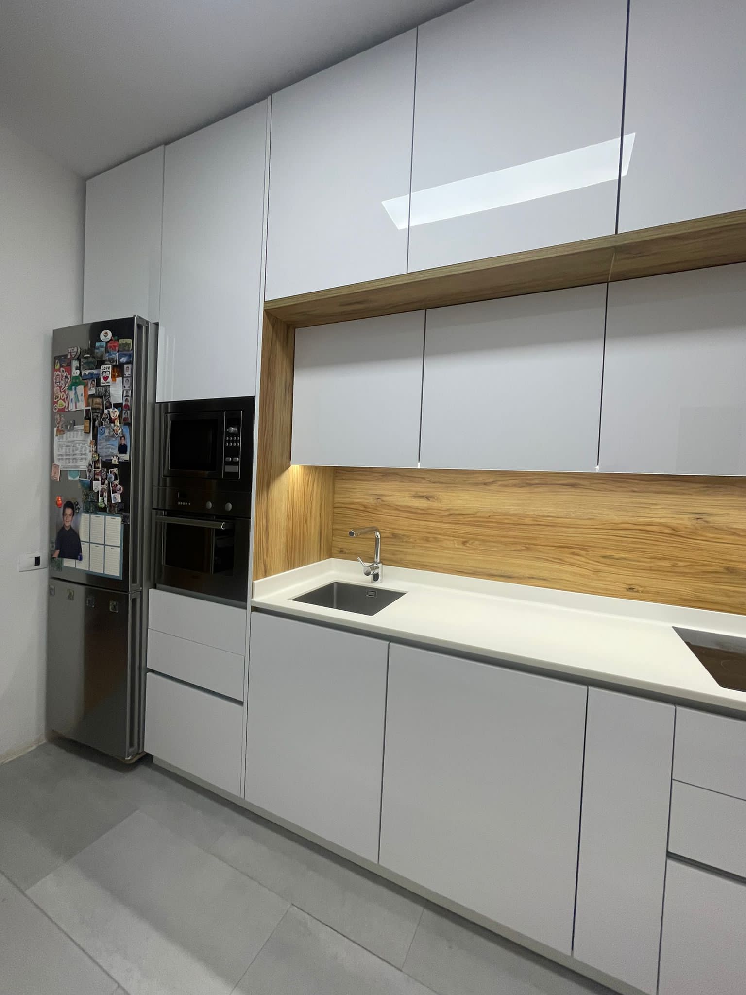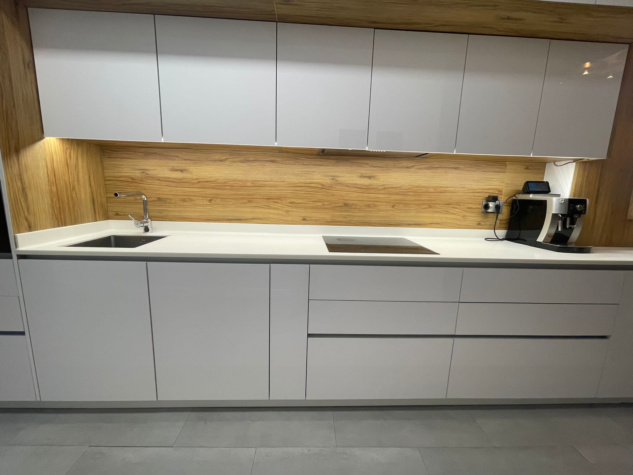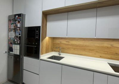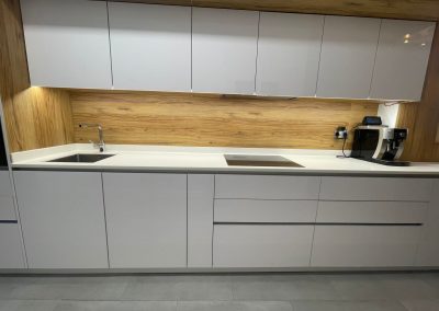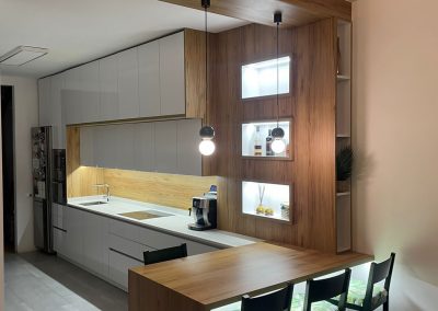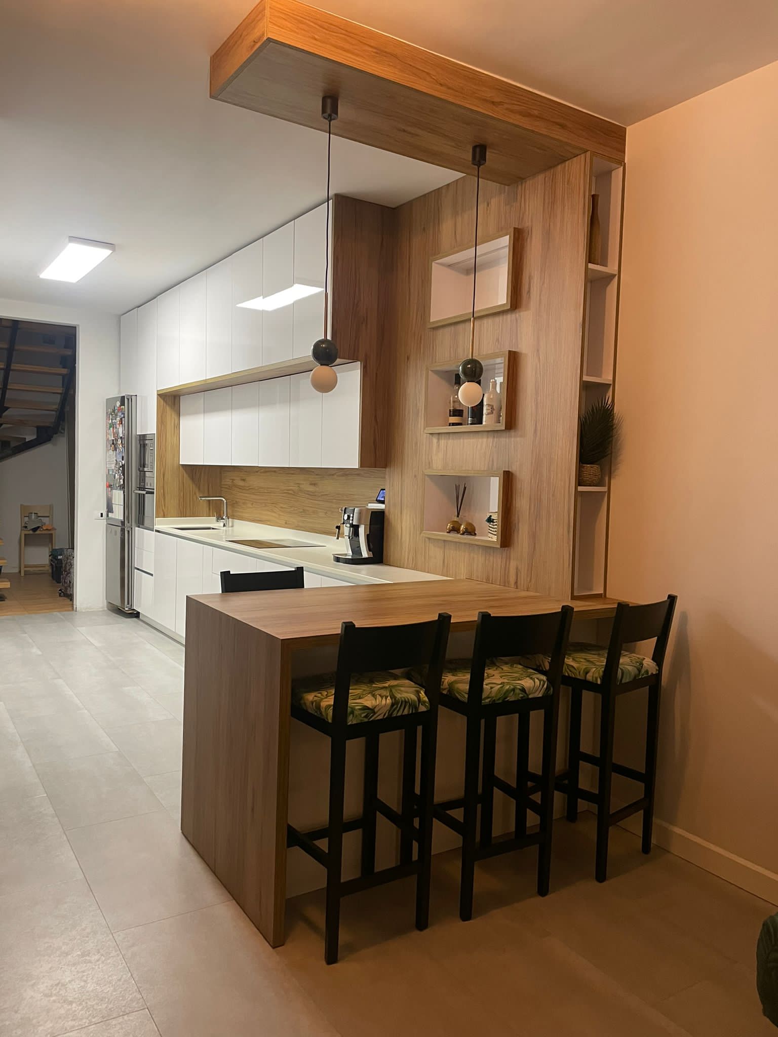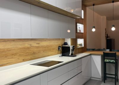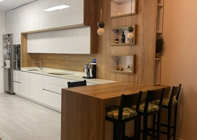 Cocina con exteriores en blanco brillo, destacando una elegante zona de barra equipada con cubos iluminados con luces LED. Los interiores, en tono gris antracita, añaden un toque de sofisticación. Esta combinación de elementos proporciona un ambiente moderno y funcional, ideal para disfrutar de momentos al aire libre con estilo y comodidad.